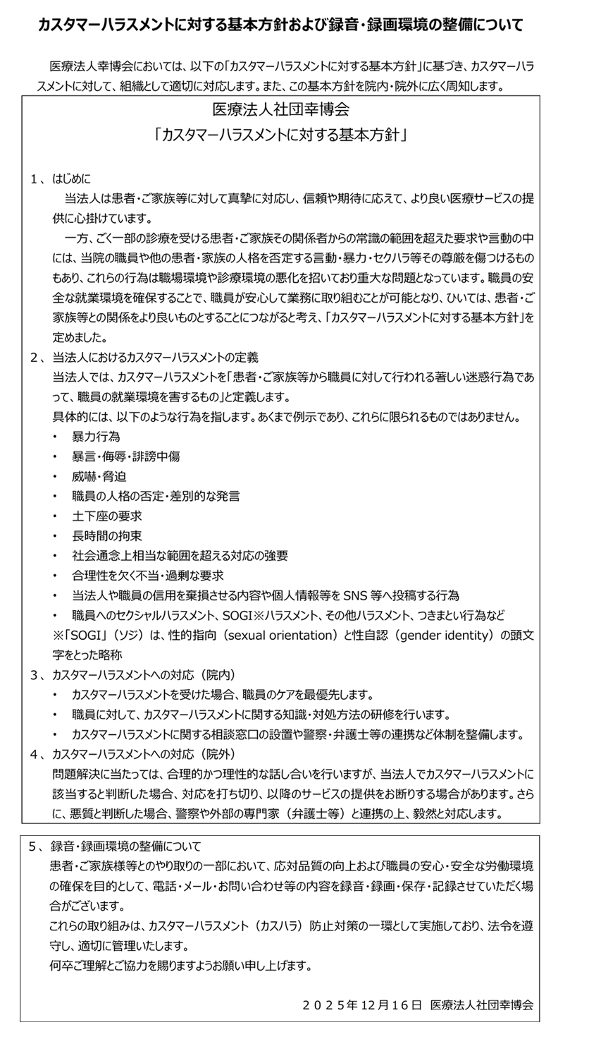 医療法人幸博会においては、以下の「カスタマーハラスメントに対する基本方針」に基づき、カスタマーハラスメントに対して、組織として適切に対応します。また、この基本方針を院内・院外に広く周知します。